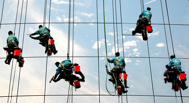 2、煙臺德力保潔公司的工作人員之間要有良好的協(xié)調(diào)合作精神:確認(rèn)應(yīng)清理部分已清理干凈,滑動吊籃或吊板,繼續(xù)向下清理。清理墻面時,不允許嬉笑吵鬧及攜帶與工作無關(guān)的物品,工作人員之間要相互幫助。清理完成后,在地面工作人員的指揮下,小心的從吊籃上下來。收拾好清理工具后方可離去。